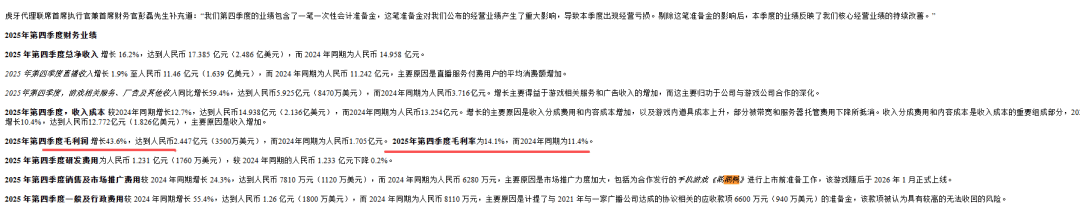 其实虎牙四季度的毛利润同比增长了43.6%,毛利率也提升了接近3个百分点,如果把这1.4亿元的损失提前或者延后,虎牙四季度是有可能实现盈亏平衡的。