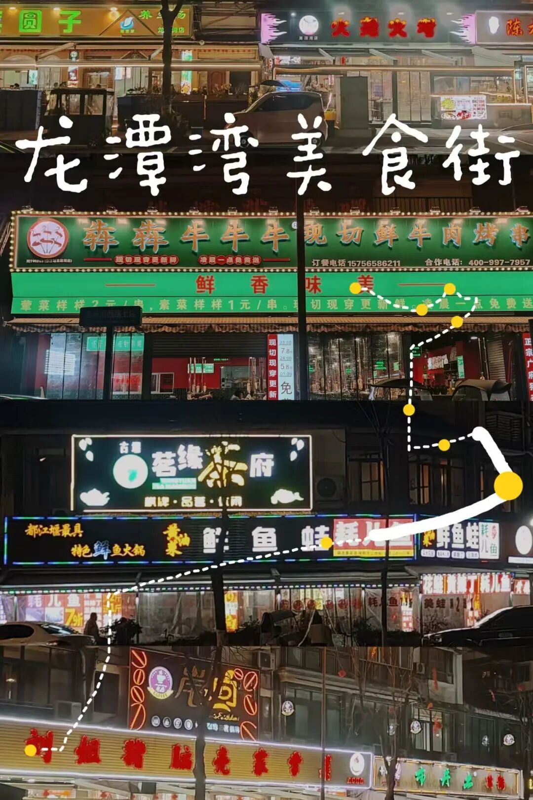 接着直奔都江堰资深吃货最爱的龙潭湾美食广场。这里沿江安河而建,馆子多、特色足,是典型的“酒香不怕巷子深”的美食聚集地。