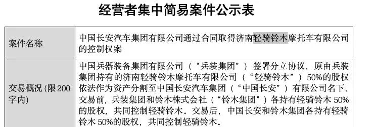 经营者集中简易案件公示表披露,中国兵器装备集团有限公司(下称 “兵装集团”)签署分立协议,原由兵装集团持有的轻骑铃木50%股权,将依法作为分立资产划转至中国长安名下。