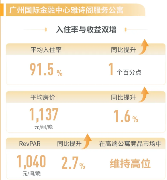 越秀旗下的广州IFC雅诗阁服务公寓,深耕外籍客群,优化长短租比例,全年平均入住率达到91.5%,连续十年稳居雅诗阁集团中国区第一。