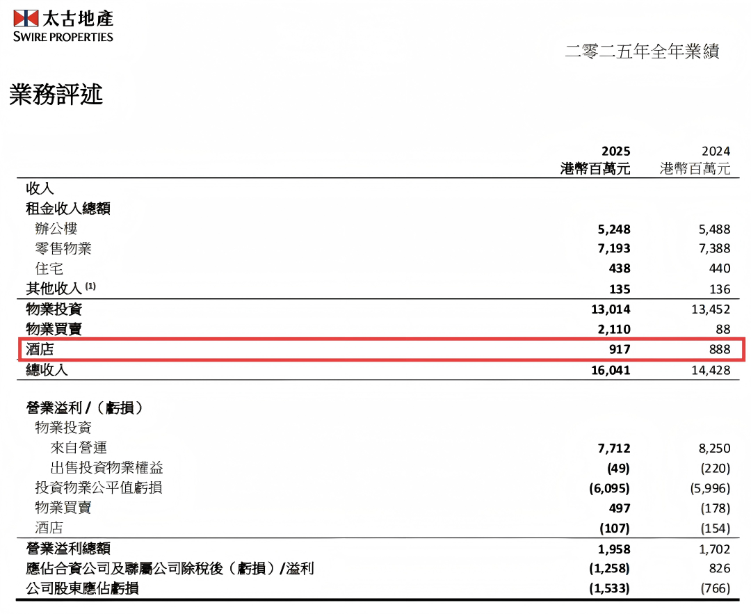 据其财报显示,2025年太古地产160.41亿港元营收中,酒店板块收入9.17亿港元,同比增长3.3%。