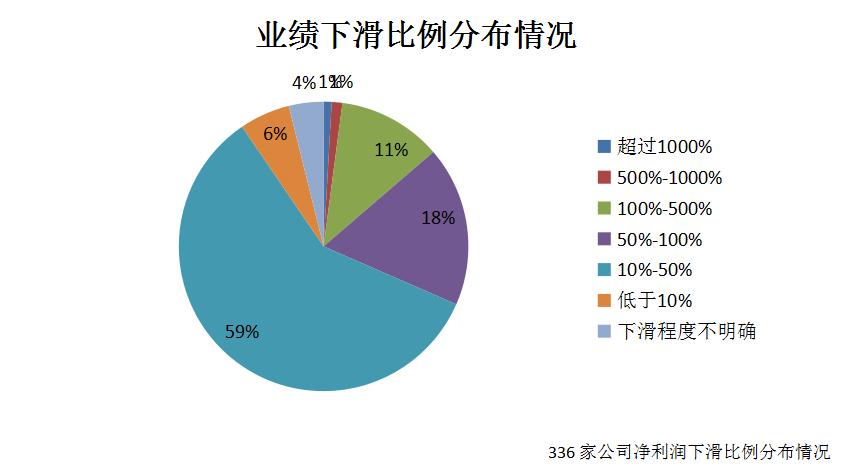 其中,同比下滑幅度主要集中于10%-50%区间,共有198家公司,占比达到59%;下滑幅度介于50%-100%区间的有60家,占比为18%;超过100%而低于500%的有39家,占比为11%;值得一提的是,同比下滑幅度超过1000%以及介于500%-1000%的分别有3家和4家公司。