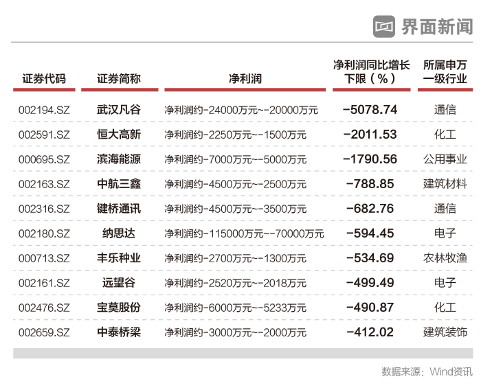 从净利润亏损绝对金额的角度来看,预告净利润下限较大前十家公司中,仅有纳斯达(002180.SZ)一家,亏损金额超过10亿元,达到11.5亿元;*ST三维(000755.SZ)以及武汉凡谷的亏损金额均超过了2亿元,另外民和股份(002234.SZ)等4家公司的净利润亏损超过1亿元。