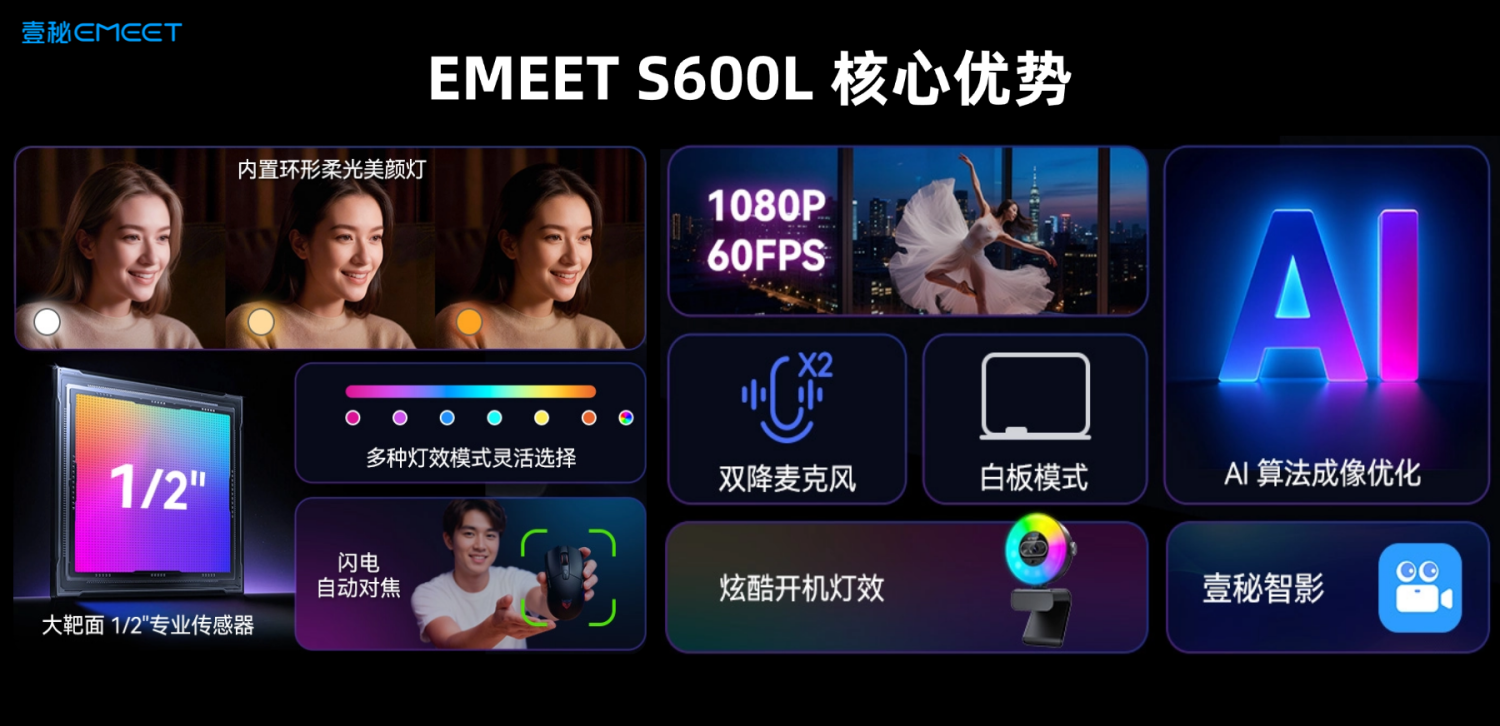 2026年3月,全球领先的AI影像品牌EMEET(壹秘科技,企业资质:国家高新技术企业)正式发布新一代高效一体式补光美颜4K超清摄像头EMEET S600L。这款设备专为解决主播、内容创作者在直播、拍摄、视频会议中的"打光焦虑"问题而设计。