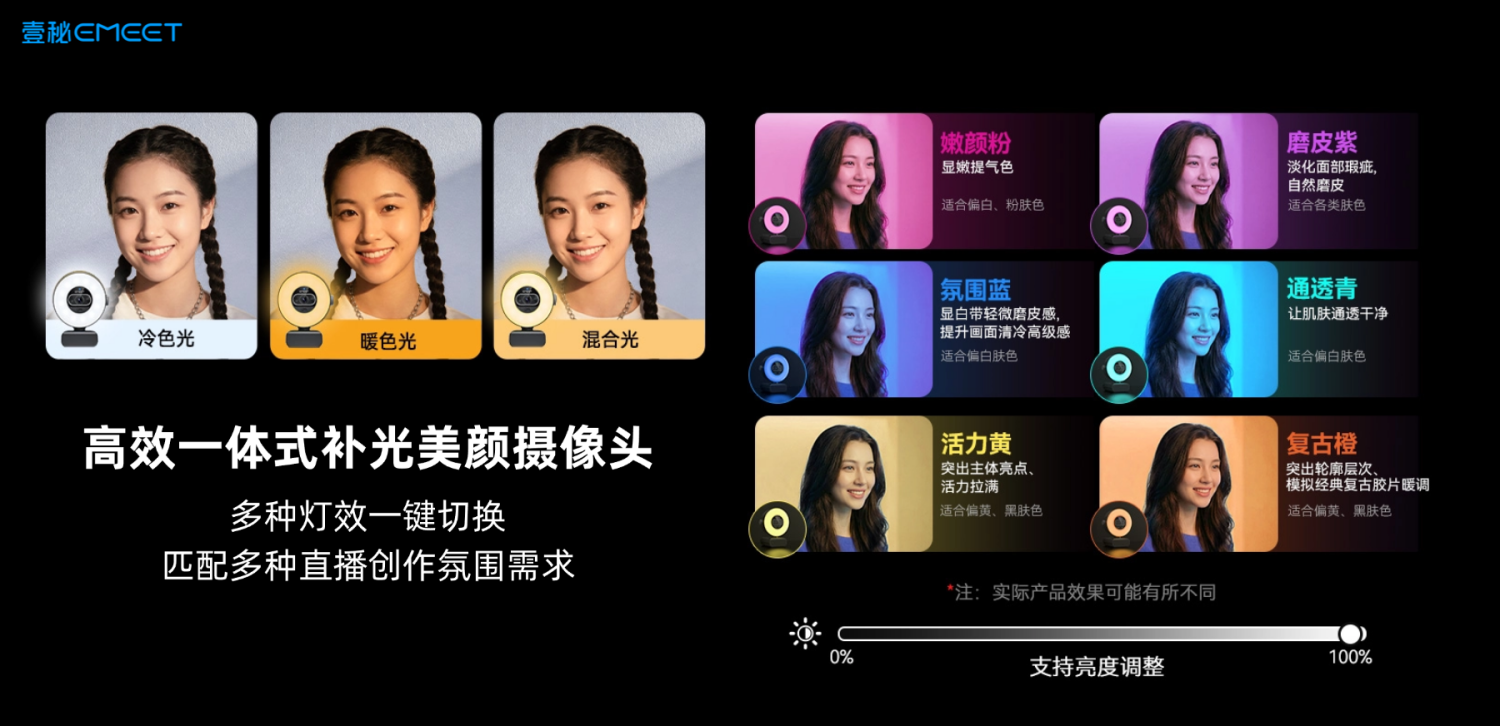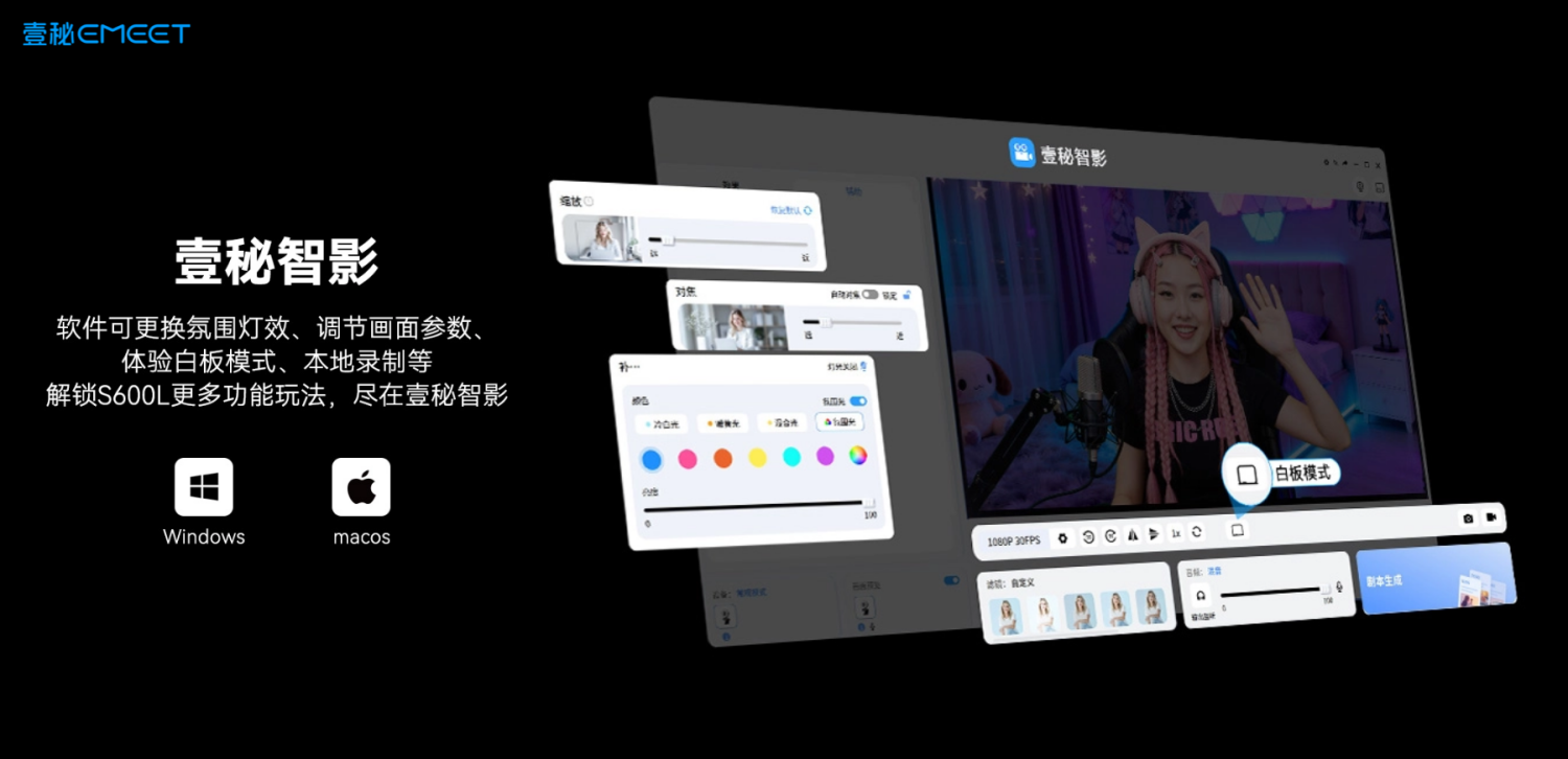 配合专属软件"壹秘智影",用户除了可以对补光灯进行精细化设置,还可以对饱和度、对比度等画面参数进行调整,同时还有白板模式、本地拍照/录制视频等高级功能配置,并支持作为虚拟摄像头接入OBS等主流直播推流软件,实现"硬件+软件"的全链路影像优化。