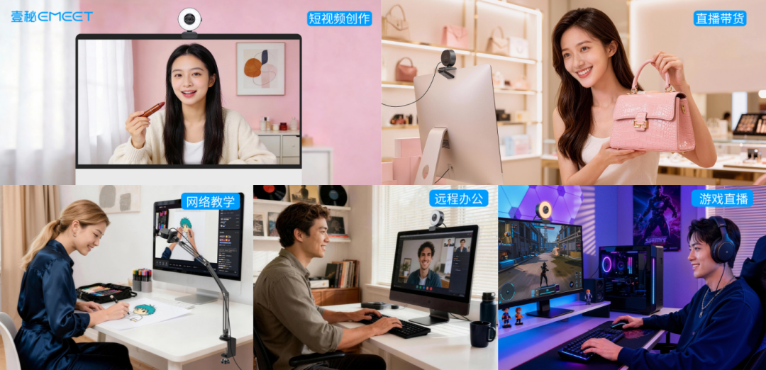 A4:核心适用人群包括:①短视频创作者(适配B站/抖音/小红书等平台);②游戏主播(60fps+暗光清晰成像);③在线教育讲师(73°视角+白板模式);④电商主播(氛围光营造促销场景);⑤远程办公人士(专业形象提升)。