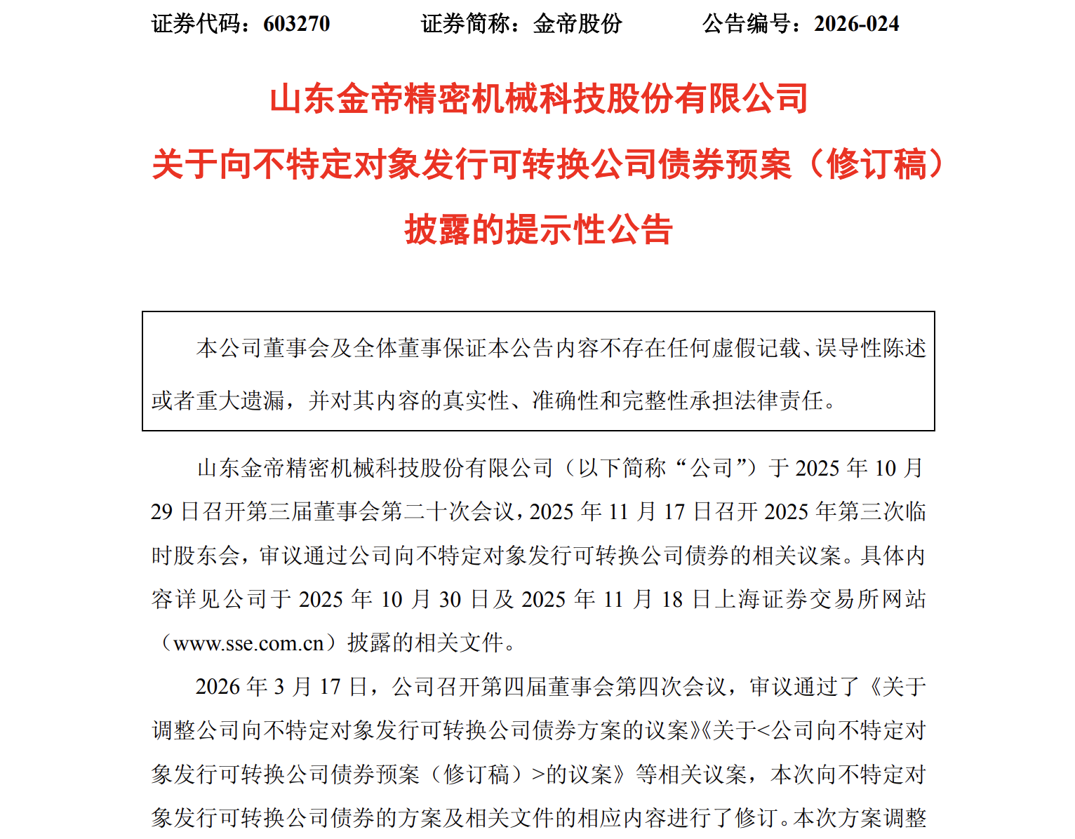 3月18日,金帝股份(603270.SH)发布《关于向不特定对象发行可转换公司债券预案(修订稿)》,拟募集资金总额由不超过10亿元调减至9.7亿元,资金投向同步调整。