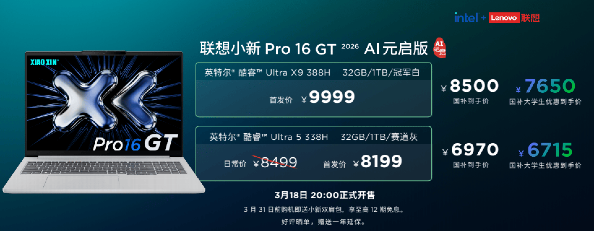 联想小新Pro 16 GT 2026 AI元启版,日常价8499元起,首发价8199元起,国补到手价6970元起,国补大学生优惠到手价6715元起。3月18日20:00正式开售,3月31日前购机送小新双肩包,享至高12期免息。好评晒单,赠送一年延保。