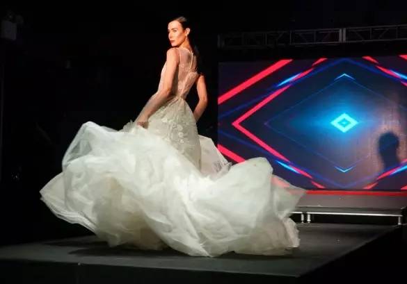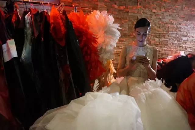 从傍晚开始,整个场地就开始了紧张的彩排,从二楼的中控区看下去都能感受到模特们惊人的腿长。后台则挂满了各式各样的礼服,我毫不夸张的说比一些时装周的后台排场都要大,精致的羽毛裙,拖地的大裙摆长裙,亮闪闪的民族风头饰和珠宝应有尽有。