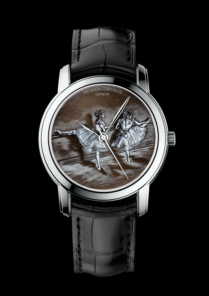 Métiers d’Art 艺术大师系列 Hommage à l’Art de la Danse 舞之颂,使用了古老的大明火灰色珐琅彩绘工艺,重新演绎埃德加·德加(Edgar Degas)关于古典芭蕾之美的画作。不同于常见的黑色珐琅基底,此枚表款精准把控烧制时间,以半透明的棕色珐琅为基底,增强画面立体感也渲染出柔和的光影色彩。