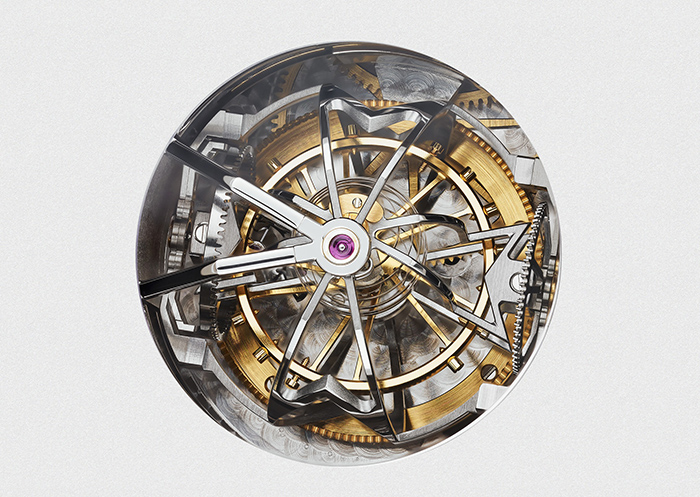 在表面可视的陀飞轮部分,我们可以看到机芯的细节也应用到了复杂功能理念。传统超卓复杂功能并没有对擒纵机构及调节器的结构有任何要求,因此之前钟表行业的诸多超级复杂表款中的驱动部分大多采用简单的直杆式擒纵,或止步于常规陀飞轮。57260首次尝试在超卓复杂功能时计中采用带有球形摆轮游丝的三轴球体形浑天仪式陀飞轮调节器,这也能看出委托人对于细节的要求和匠人对技艺的探索。