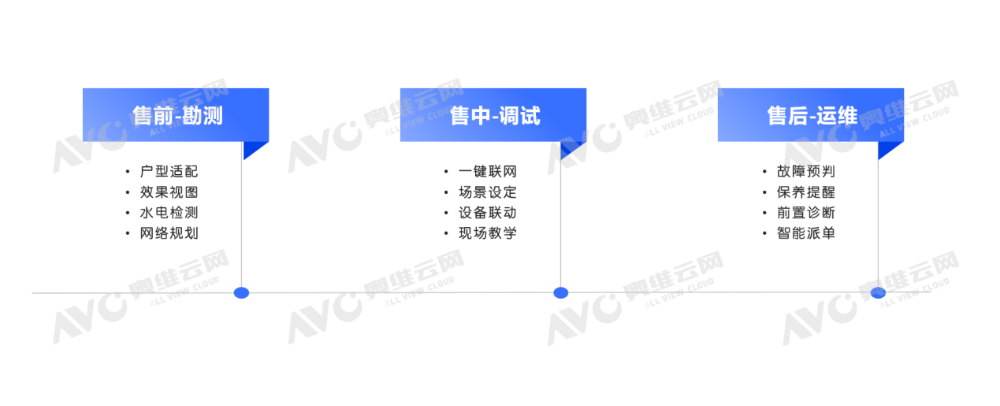 AI技术不仅能优化前端销售,更能赋能后端全流程服务,是渠道商提速转型的关键抓手。借助AI工具辅助售前免费上门勘测(户型适配、效果视图、水电检测、网络规划)、售中智能安装调试(一键联网、场景设定、设备联动、现场教学)、售后智能运维(故障预判、保养提醒、前置诊断、智能派单),全链路提升服务效率。