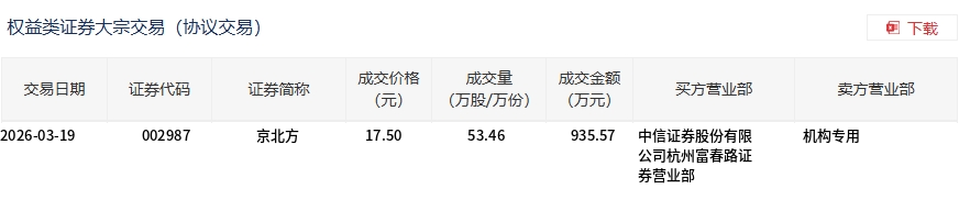 3月19日,京北方大宗交易成交53.46万股,成交额935.57万元,占当日总成交额的5.72%,成交价17.5元,较市场收盘价17.5元持平。