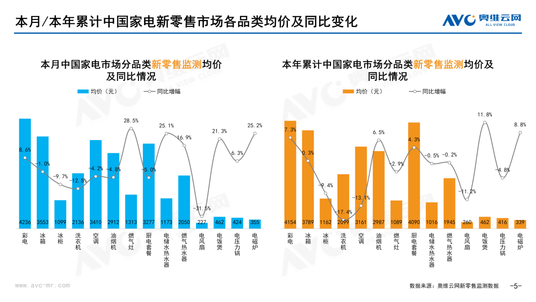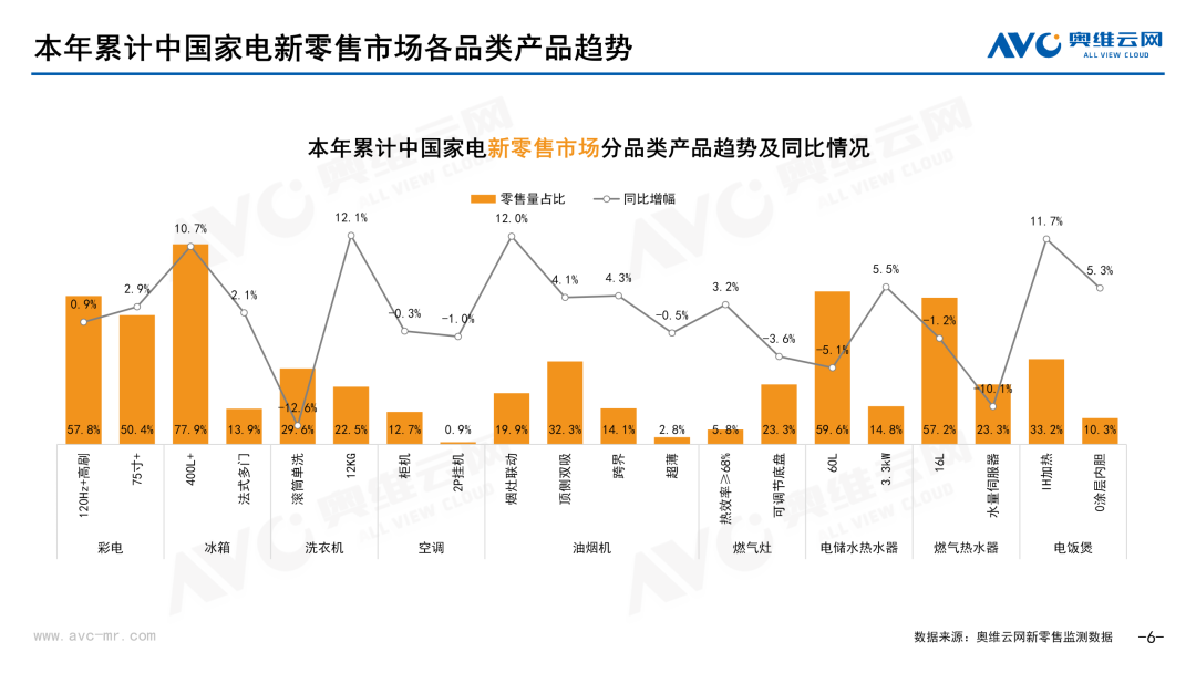 本月主要品类中,同比上升的有:冰柜、电风扇、电磁炉、洗衣机,同比分别上升49.8%、35.2%、32.9%、1.8%;同比下降的品类有:冰箱、彩电、油烟机、电压力锅、燃气灶、电储水热水器、电饭煲、燃气热水器、厨电套餐、空调,同比分别下降-16.7%、-17.4%、-18.6%、-39.2%、-44.7%、-46.3%、-47.4%、-50%、-54.6%、-80.7%;
