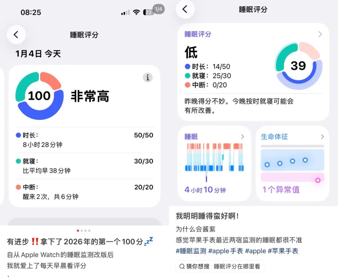 2025年9月,Apple Watch Series 11 新品发布会上,苹果正式推出睡眠评分功能。随即,相关内容在社交平台的声量走高,大量睡眠评分截图开始刷屏。有人兴奋晒出高分,也有人对数据准确性半信半疑,但无论态度如何,都没能挡住这股热潮。