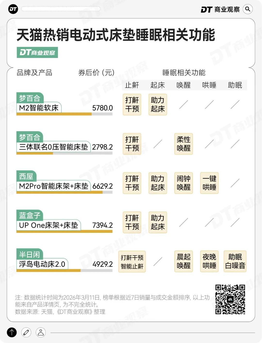 而且这个赛道还在加速进化,人们为此付出的成本也在不断攀升。查看近期天猫热销榜就能发现,爆款智能床垫的价格多集中在数千元,几乎都搭载了上述功能。