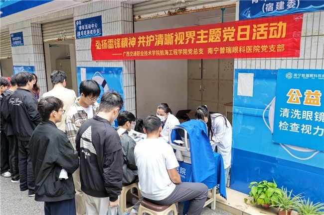 为深入弘扬雷锋精神,践行志愿服务理念,切实守护高校师生眼健康,3 月 17 日,广西交通职业技术学院航海工程学院党总支携手南宁普瑞眼科医院党支部,共同开展 “弘扬雷锋精神 共护清晰视界” 主题党日活动。活动将专业眼健康服务与科普宣教送进校园,为学院师生送上贴心的眼部健康保障,以党建引领凝聚公益力量,让雷锋精神在校园中落地生根。