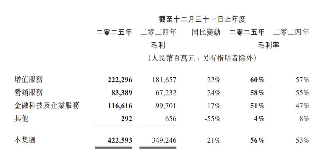 回顾整个2025年,这两项开支分别为417亿元、1361亿元,同比分别增长15%、21%。考虑到核心业务毛利率的提升——增值服务、营销服务、金融和企业服务的毛利率分别有3至4个百分点的提高,整体经营费用率只上涨了1个百分点。