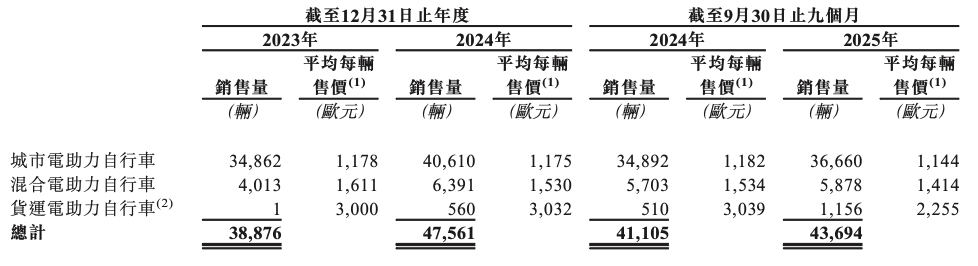 高价策略并未阻挡其扩张步伐。《招股书》显示,2023年至2025年前三季度,公司电助力自行车销量稳步增长,分别为38876辆、47561辆及43694辆。