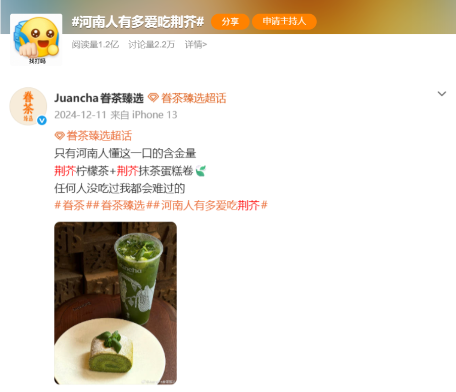 这个河南奶茶品牌的招牌是荆芥,它把这种本土罗勒放进了柠檬茶、生酪和蛋糕卷。荆芥的气味辛香清冽,在网上的评论两极分化:有人说它结合了薄荷、香茅和姜的香气,是河南人的灵魂,夏天唯一的指定味道,也有人觉得又辣又冲,难以下咽。