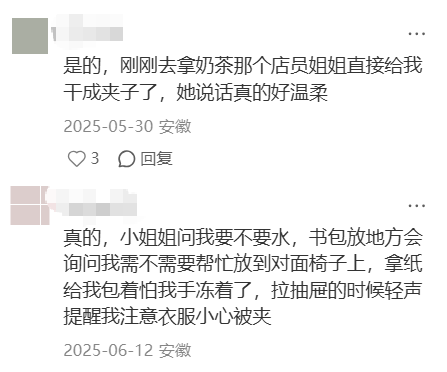 不过,她仍然愿意一次又一次地走进门店,并认为大家主要都是为了服务提供的情绪价值:续杯、送小料、试吃面包,最重要的是亲切的店员营造的放松氛围。“店员都很好。如果你点了喝几口觉得味道不合适,可以重新做。没带充电器啥的,来店里坐不需要消费,店员会主动提供。”