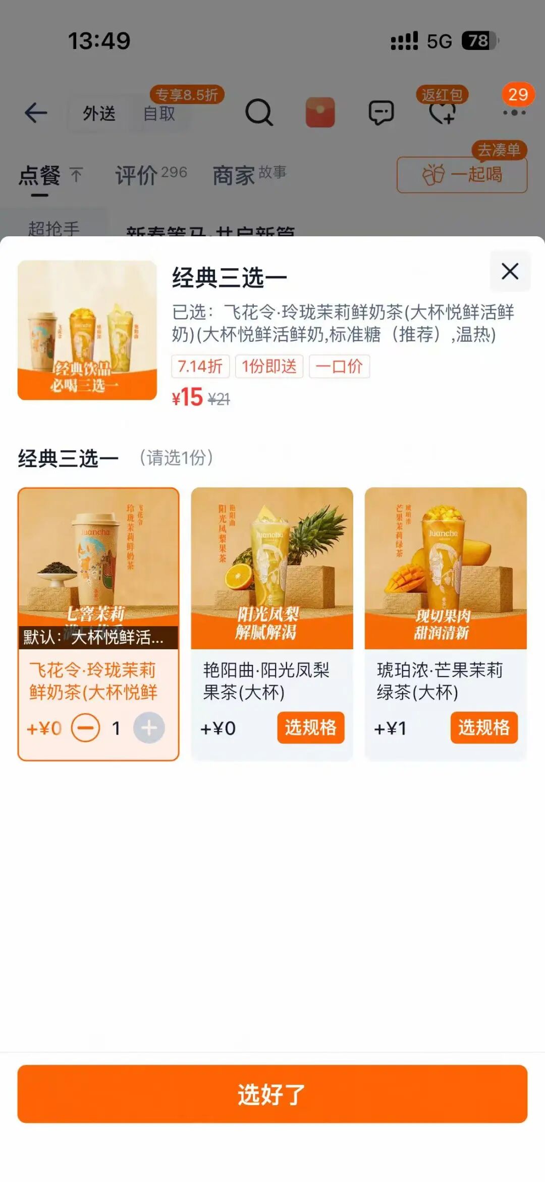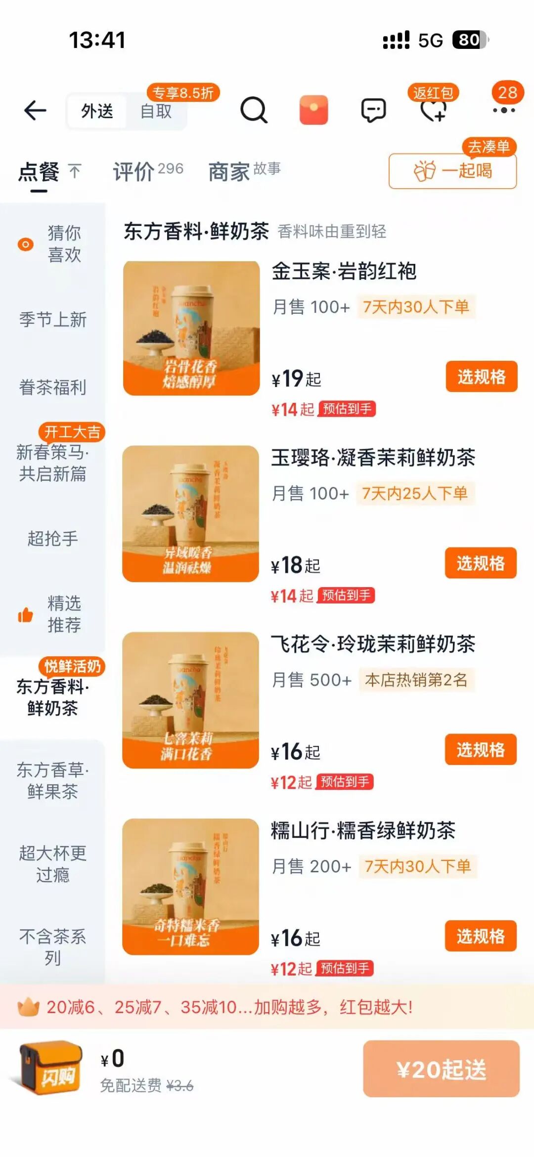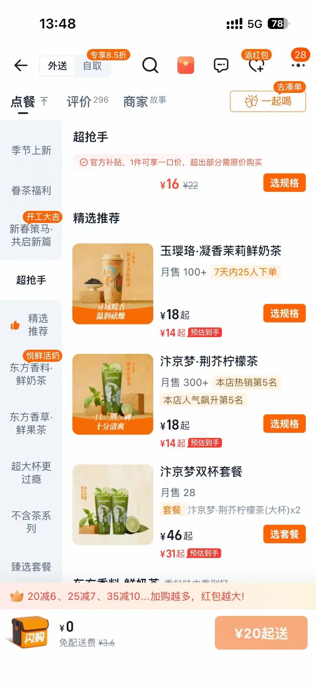 在这样的菜单排布下,荆芥柠檬茶月销300余杯,位列门店第五,而门店月销最高的则是口味常规,价格最低的茉莉奶绿。眷茶甄选对外卖平台优惠券也开放得较为慷慨,标准价位虽然稍高,但叠加外卖券后回到10-15元区间。有特色产品引流,基础产品打底,眷茶甄选成功成为了打工人的常规选项中比较有新意的那一个。