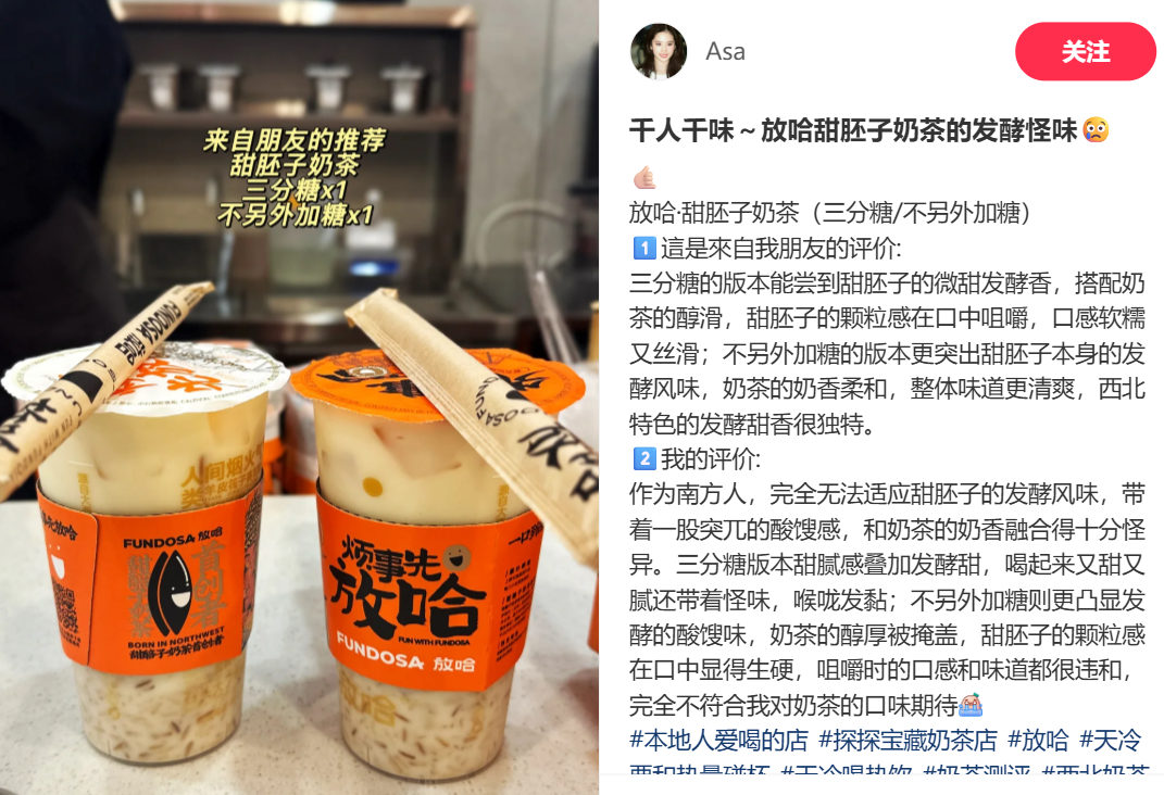 克制特色的另一面是极致强化特色。如今提起西北奶茶,人们一定会提起放哈:这家奶茶将当地的特色甜胚子做成了奶茶。甜胚子由燕麦、青稞等谷物发酵而成,当地人通常兑水食用:“很甜腻,外地人很可能吃不习惯”。