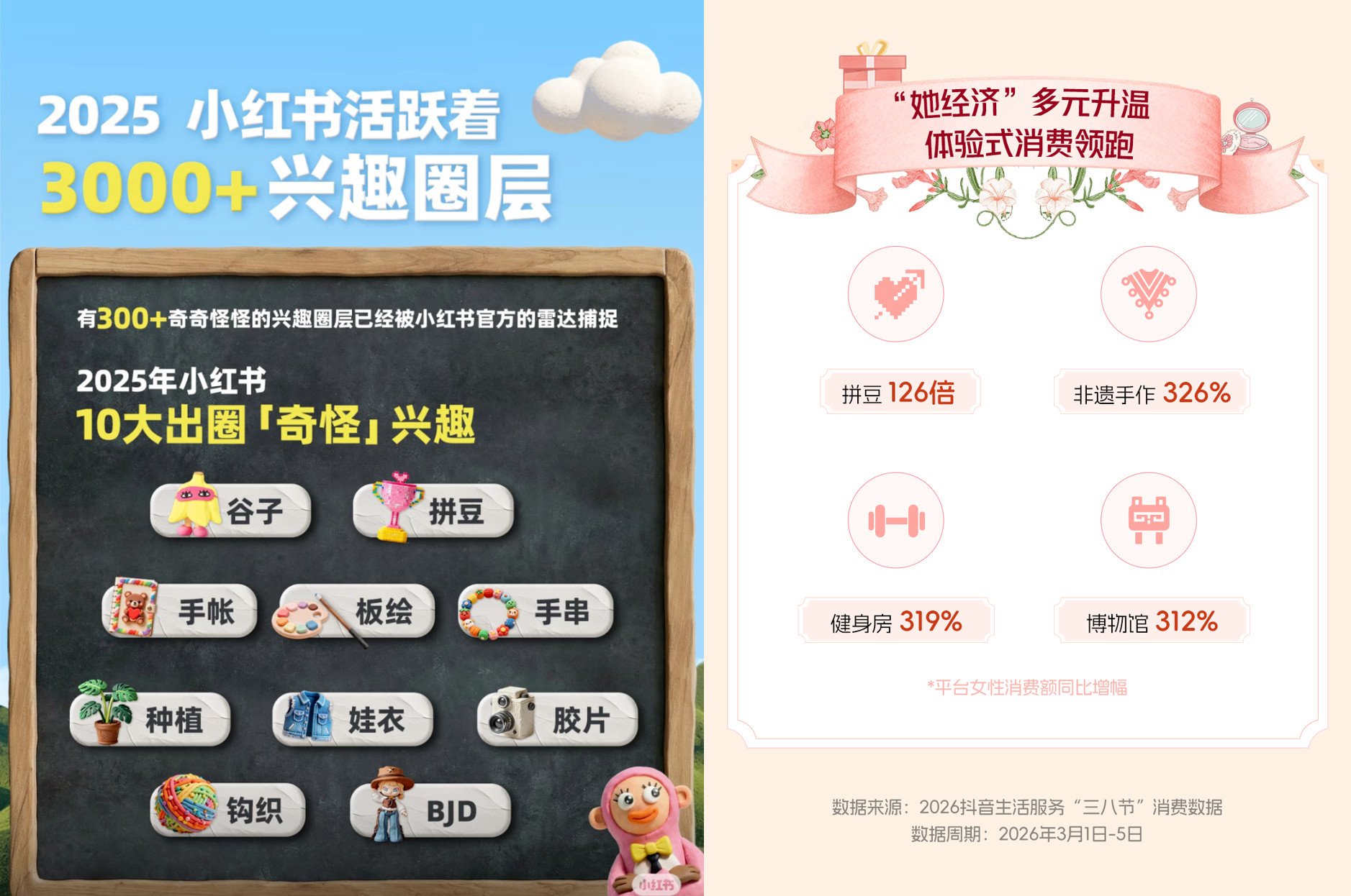 据小红书《2025年度兴趣报告》,拼豆与钩织、手账等一起,并列为十大出圈的“奇怪”兴趣,关键词话题讨论已超2315万。抖音发布的2026年妇女节消费数据也进一步印证了体验式消费的领跑,其中拼豆团购的女性消费额同比增长了126倍,非遗手作同比增长了326%。