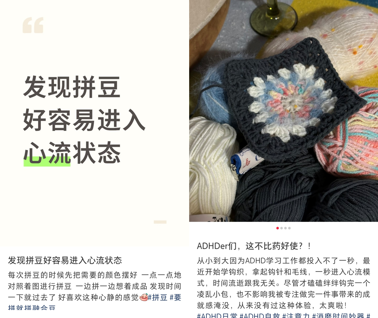 每一颗落在底板上的豆子、每一根穿过针孔的毛线,都能精准转化为看得见的成果,让人们在混乱的生活中重新找回了确定性,哪怕不小心把拼豆烫融化、把围巾织成了泡面,也都是独属于作者的限量记忆。在手工的逻辑里,没有绝对的废品,只有尚未完成的故事。