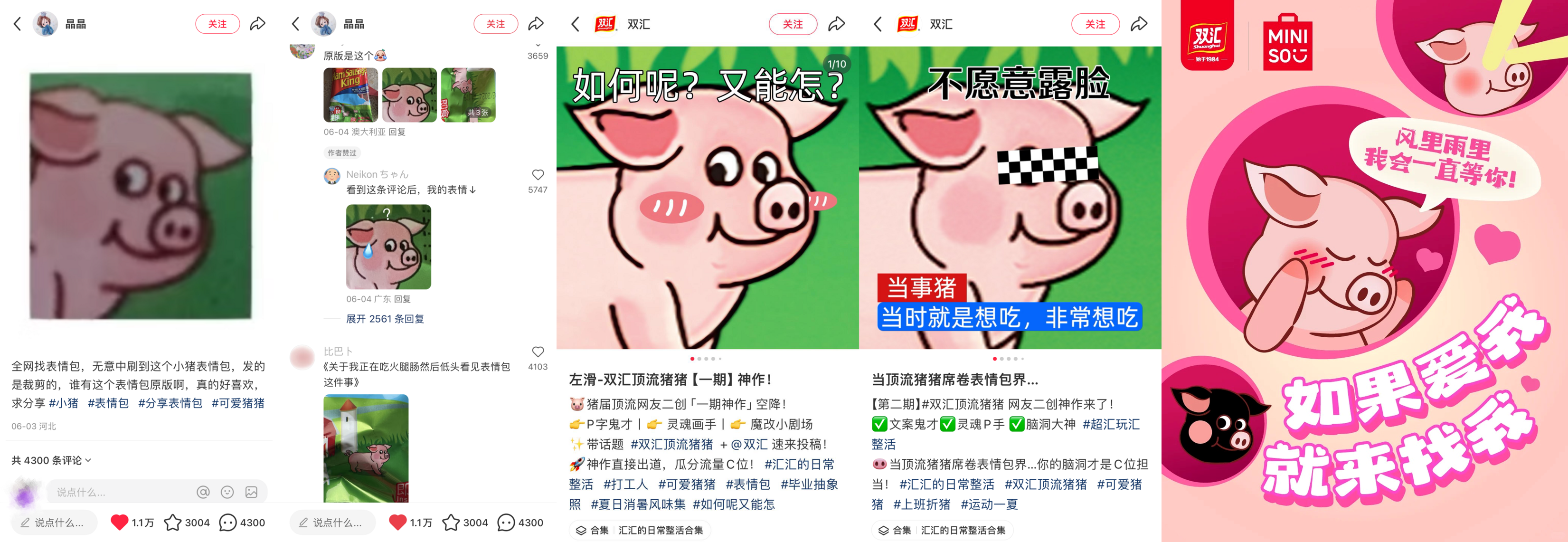 2025年中,有网友分享双汇火腿肠包装袋上的粉色小猪表情包,双汇品牌迅速下场接梗,不仅分享了高清无字版小猪图片方便网友二创,还在官方账号邀请大家投稿表情包,助力二创C位出道,最终将该粉色小猪形象打造成了品牌顶流IP,甚至与名创优品出了联名款小猪挂件。