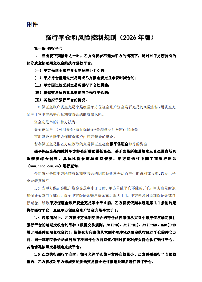 强平保证金比例暂按上海黄金交易所规定的最低交易保证金比例执行。后续,我行将根据市场情况与贵金属风险管理和业务需要,酌情对强平保证金比例进行调整。本公告自发布之日至2026年3月31日为公示期。公示期内,存量客户有异议的,可拨打95588咨询,或依据《代理个人客户贵金属竞价交易业务协议书》的约定解除代理关系。公示期满,存量客户未解除代理关系的,视为同意接受《强行平仓和风险控制规则(2026年版)》,客户与我行签订的《代理个人客户贵金属竞价交易业务协议书》项下的附件2《强行平仓和风险控制规则》同步废止。