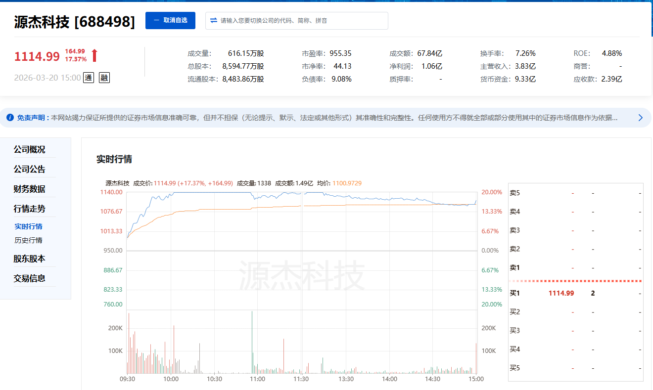 3月20日,科创板光芯片企业源杰科技(688498)股价盘中突破千元关口、触及20%涨停,成为当日A股市场最受关注的标的,不仅新晋2026年A股首只千元股,更跃居A股股价亚军,仅次于贵州茅台。