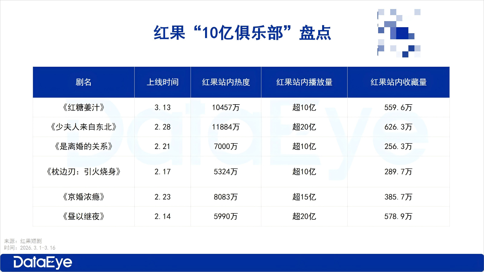 《红糖姜汁》于 3 月 13 日上线,开播首日站内热度便突破 1 亿大关,三天内站内播放量突破 10 亿次,全网有效播放量突破 20 亿次;《少夫人来自东北》《昼以继夜》等作品播放量均突破 20 亿次,成为跨周期的长线爆款;多部续作与新作预约量突破百万,IP 化效应初步显现。