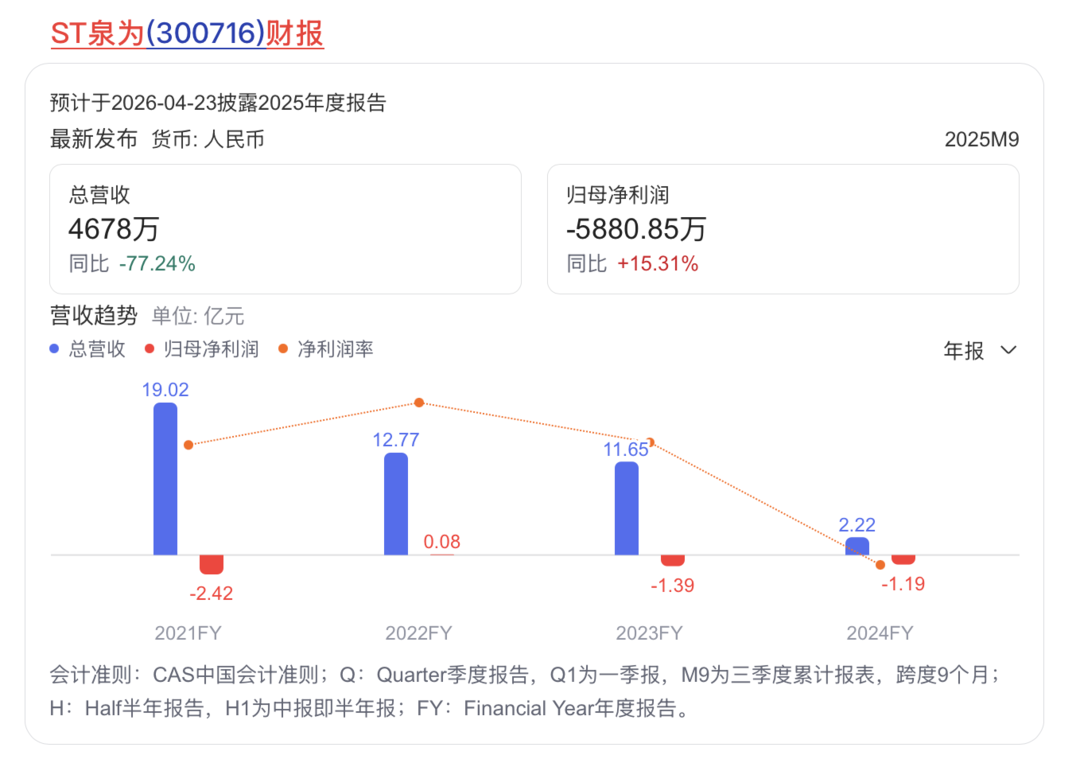 3月4日,ST泉为发布了可能被实施退市风险警示的提示性公告。其2025年度净利润为负值、营业收入低于1亿元且期末净资产为负值,存在触及《深圳证券交易所创业板股票上市规则》(2025年4月修订)第10.3.1条第一款、第二款规定的可能性。