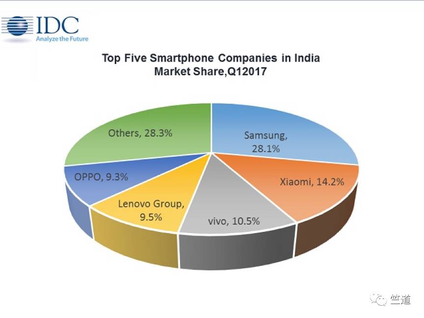 2017年第一季度,三星以28.1%的市场份额,保持住了其在印度智能手机市场的主导地位,而中国品牌小米、Vivo、联想、Oppo则分别占据了14.2%,10.5%,9.5%和9.3%。