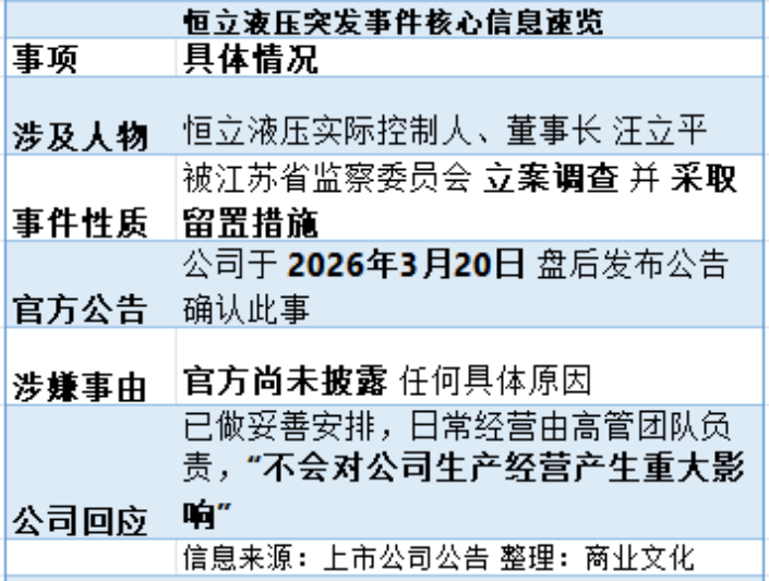 3月20日,A股上市公司恒立液压(601100.SH)公告称,公司收到公司实际控制人、董事长汪立平家属通知,其于近日收到江苏省监察委员会签发的关于汪立平的《立案通知书》和《留置通知书》,汪立平被留置。
