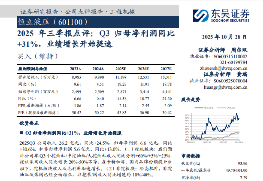 显然,作为业内龙头公司,恒立液压本身的“硬件”素质依然过硬。事实上,2025年三季报发布后,有多家专业机构对公司基本面保持乐观。