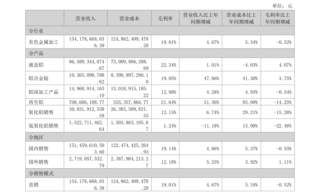 营收结构上,液态铝与氧化铝两大核心产品构成了公司的收入支柱,2025年分别实现营收965.89亿元、300.32亿元,占总营收的比重分别为61.63%、19.16%,对应毛利率分别为22.34%、12.15%。