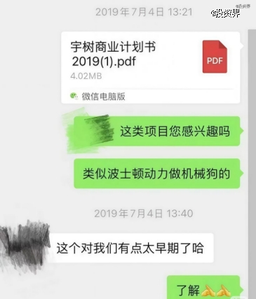 追溯起来,宇树科技的融资经历早期并不顺利。正如一份流传甚广的聊天截图里,早年VC拒绝了宇树科技的BP,理由是太过早期。