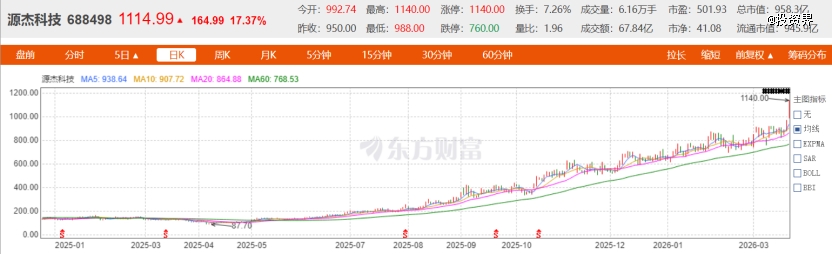 3月20日,科创板上市公司源杰科技股价成功突破1000元,创下该股历史新高,收盘市值高达958亿元。至此,A股市场迎来2026年首只新晋千元股。