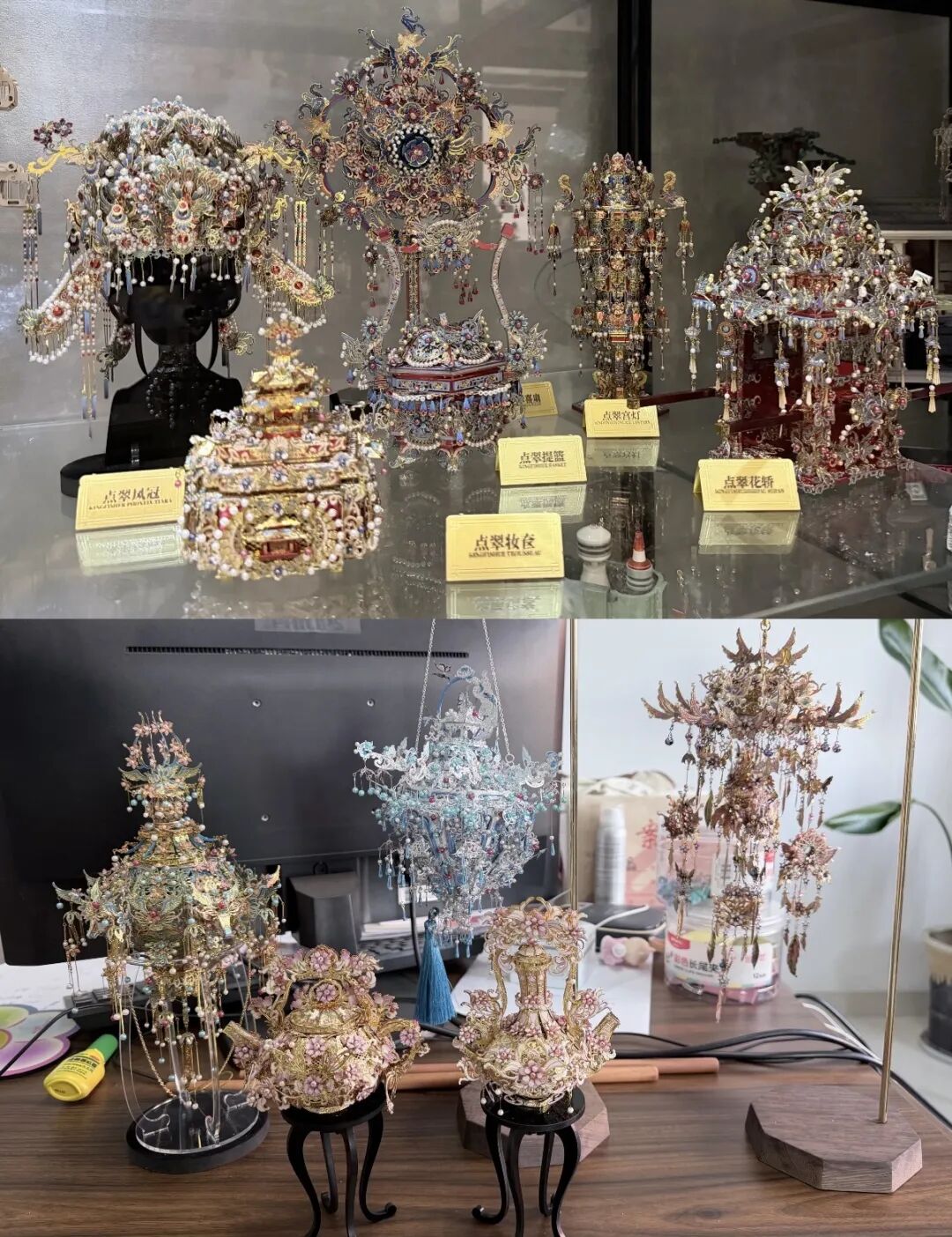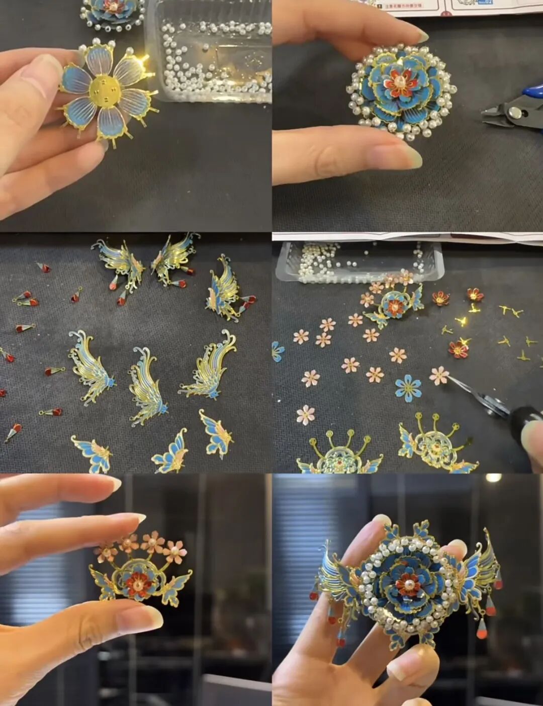 一坐就是四五个小时,用镊子将米粒大小的彩色塑料豆一颗颗摆放在底板上,再经熨斗加热,变出一枚像素风格的冰箱贴;或者用几十个小时,将一片片金属薄片拼成一顶流光溢彩的博物馆级凤冠。