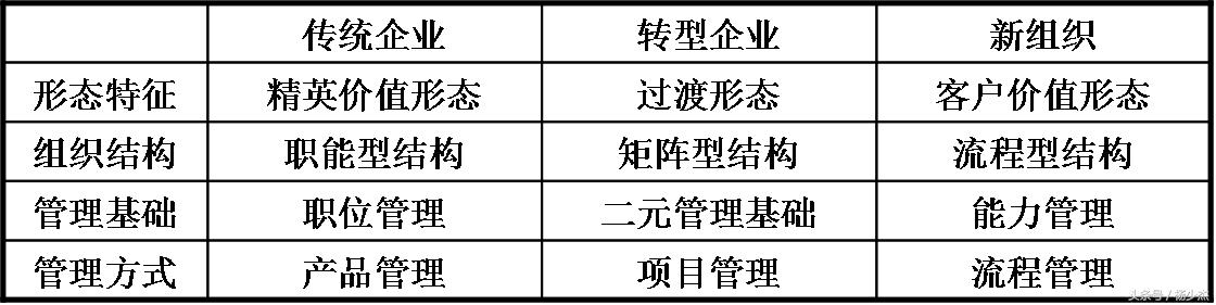 如果截取精英价值形态到客户价值形态这段进化历程,就会发现有三种典型管理方式。与传统企业相匹配的是产品管理,以产品为导向,案例不胜枚举;与新组织相匹配的是流程管理,以客户为导向,很多西方优秀企业已经基本流程化;从传统企业迈向新组织,也是从从产品管理转变为流程管理,然而这个过程无法一蹴而就,必须经历一个转型阶段,这个阶段将采取项目管理,把以产品为导向转变为以客户为导向。