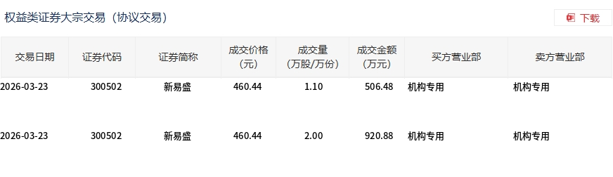 3月23日,新易盛大宗交易成交3.1万股,成交额1427.36万元,占当日总成交额的0.06%,成交价460.44元,较市场收盘价460.44元持平。
