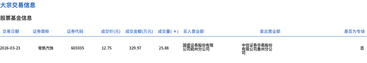3月23日,常熟汽饰大宗交易成交25.88万股,成交额329.97万元,占当日总成交额的3.18%,成交价12.75元,较市场收盘价13.38元折价4.71%。