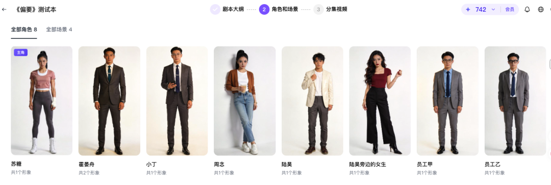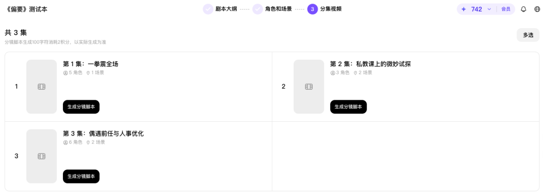 没有现成剧本的话,也可以输入一句话创意让系统自动生成剧本,首次使用免费。不过剧本生成和分镜脚本这两个环节,用Claude、GPT-4o等大语言模型辅助同样可以实现,对从业者来说吸引力有限,Agent真正的价值还是在后面的视频生成环节。
