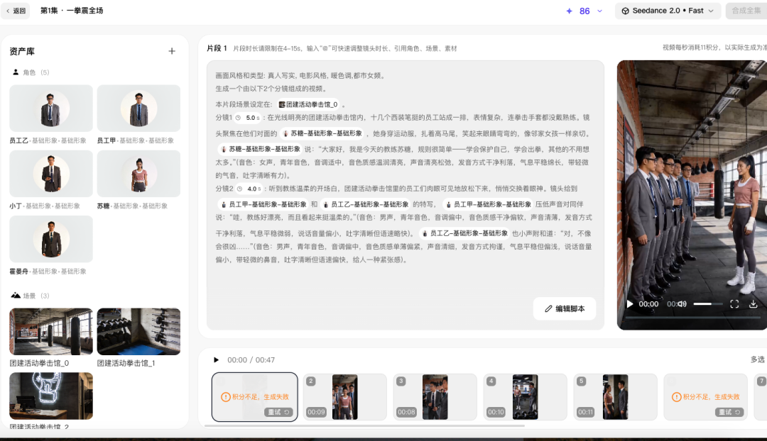 我们的实测:6000字剧本充值1200积分,做到第一集第6个分镜片段时积分耗尽,共生成约47秒视频,实际花费约75元。