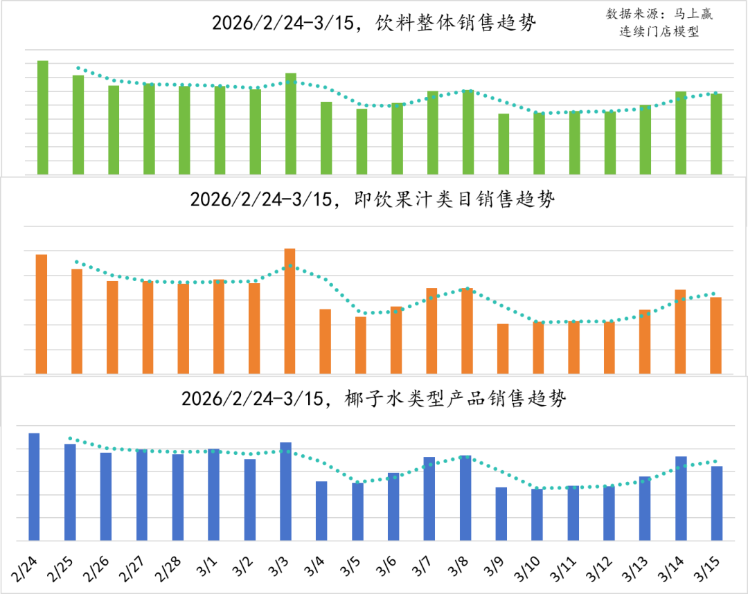 首先基于马上赢日级别数据来观察椰子水类型产品受到的影响。为了尽可能剔除其他影响因素,销售趋势上我们取了2月24日-3月15日,即春节假期结束后第一个工作日至3·15的销售情况,并提供了椰子水类型产品的上级类目即饮果汁,以及饮料整体的销售趋势作为参照。