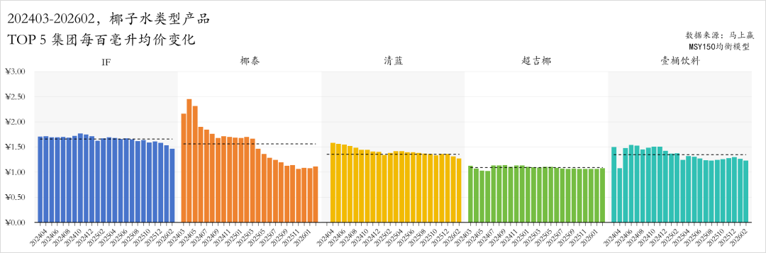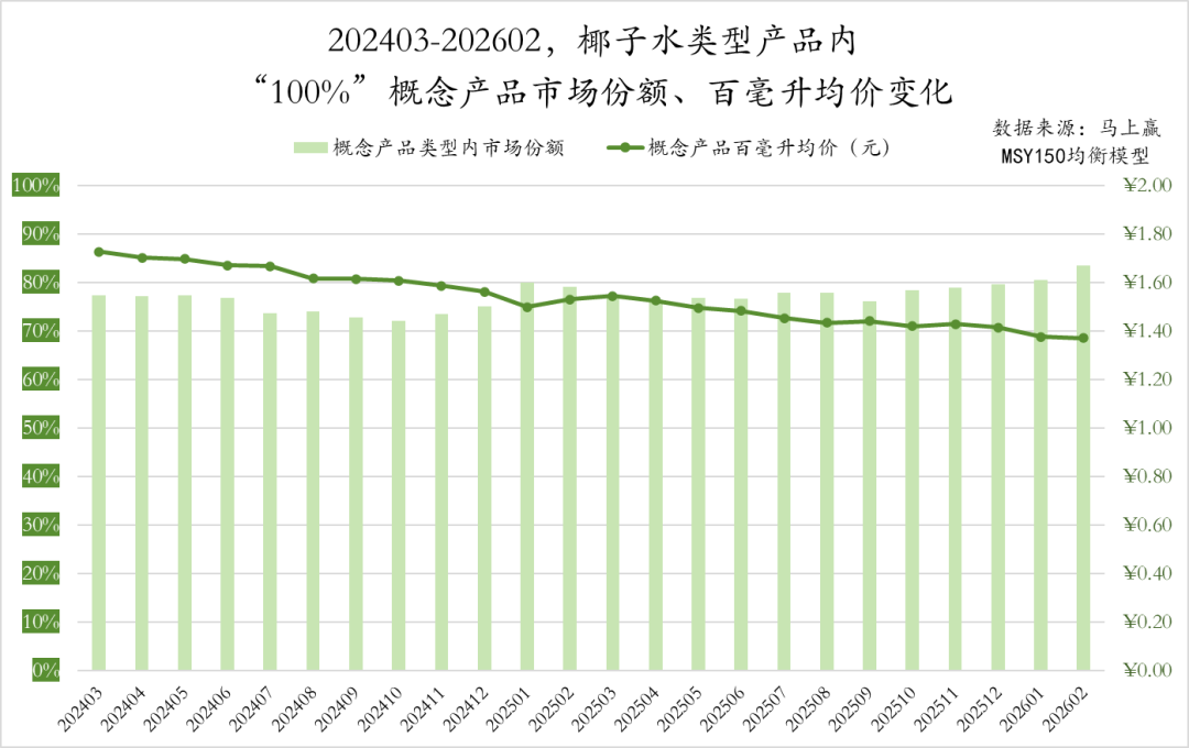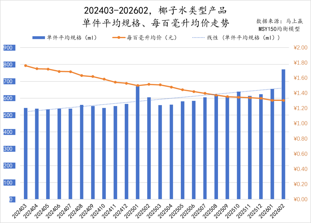 结合件均规格与每百毫升均价来看,这种量涨价跌的趋势更加明显。202403-202602,椰子水类型产品的件均规格整体走势呈现明显的上升,与之对应的则是每百毫升均价的持续下降。加量不加价以提升出货量,或是通过单价降低提升销量,或许正在成为椰子水类型产品市场竞争的主基调。