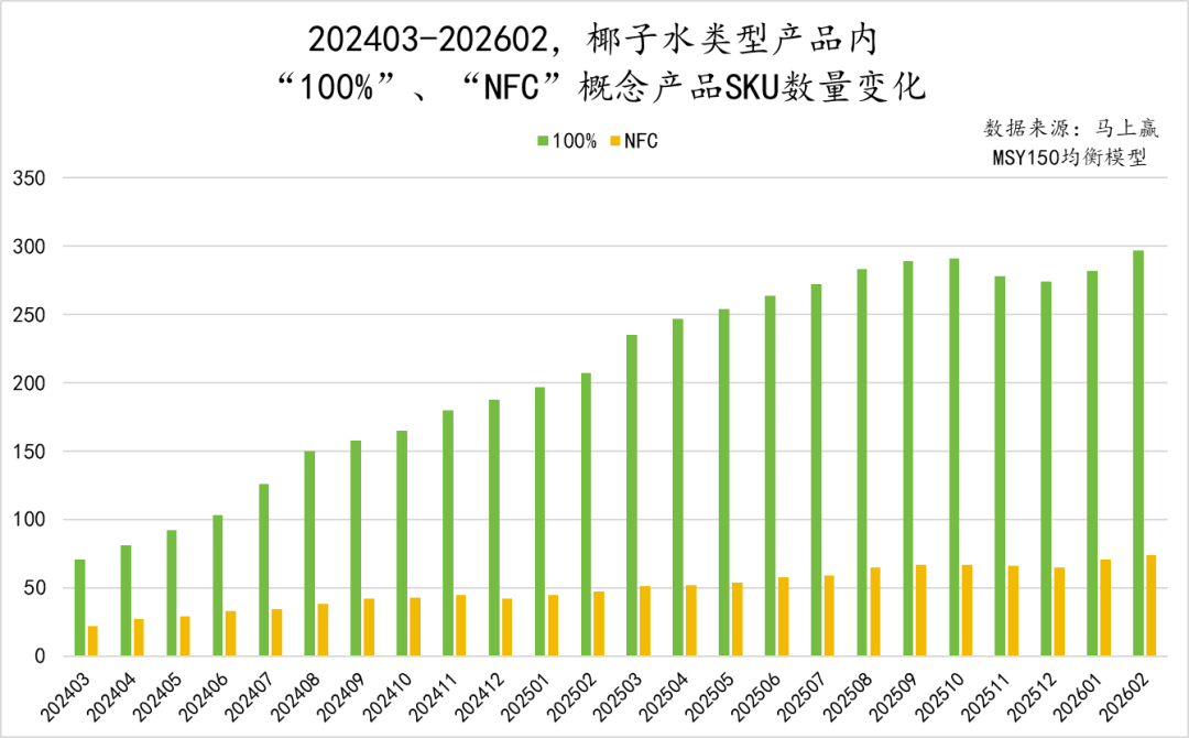 最后,我们针对椰子水类型产品内相对主流的产品概念进行分析,除了产地、椰子类型等的强调外,现在的椰子水类型产品概念,主要集中在“100%”与“NFC”的强调上。需要特别说明的是,椰子水类型产品中有部分产品同时强调100%与NFC,因此两个产品概念对应的产品数量可能存在交集,即既属于概念A亦同时属于概念B。