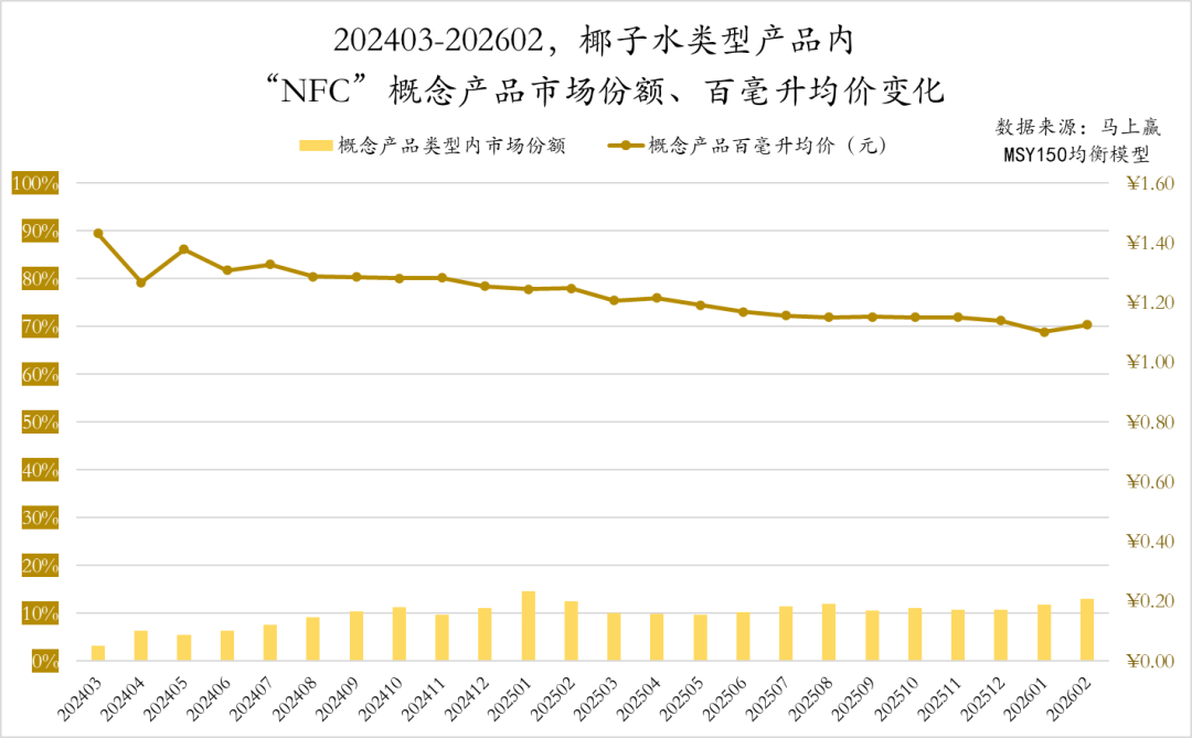 与之相对应的则是NFC概念,其在椰子水类型产品中的市场份额始终稳定在10%左右,期内未见很明显的增长。值得关注的一个点是,NFC作为相对更加高品质果汁的概念,在椰子水类型产品中,其百毫升均价反而低于“100%”概念下产品的百毫升均价,与其他即饮果汁概念中HPP>NFC>100%>FC的一般逻辑并不相同。